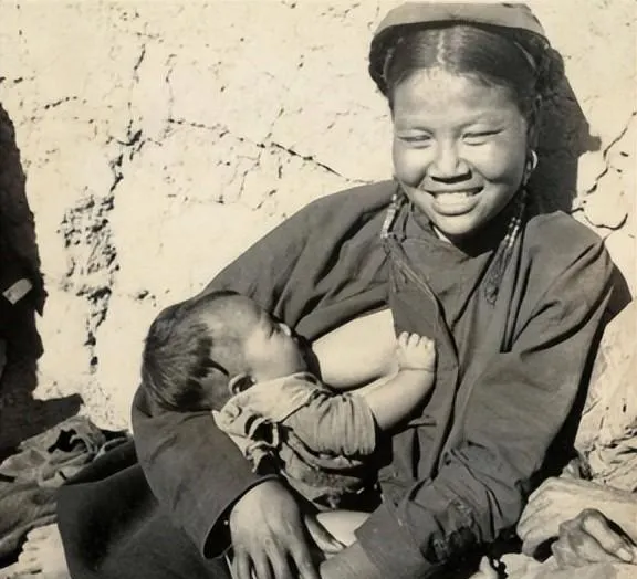 这个柔软的布兜叫襁褓,娃娃含着奶睡得香,娘亲笑得眼睛都眯成月牙,穷归穷,笑是亮的,照片把亮光都收住了。