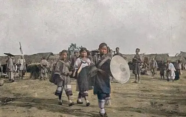 孩子手里的圆盘是铜盘,亮得像月亮,另一边的绑腿把小腿勒得紧紧的,上学路上她们会笑着比谁的盘子更响。