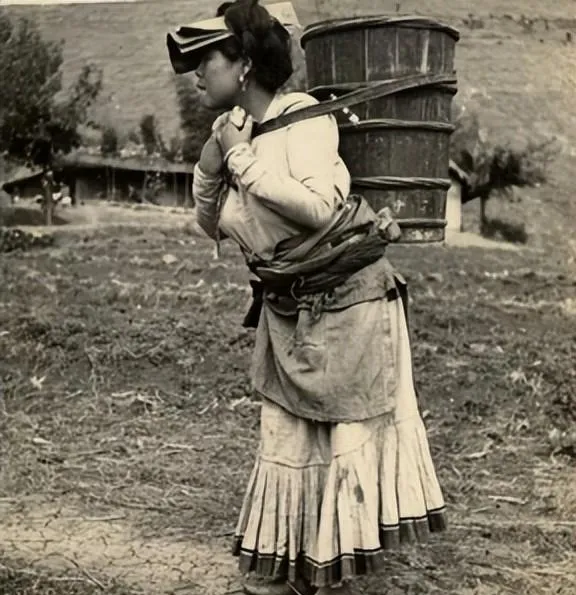 图中粗木桶叫水桶,木板一片片扣起来,用铁箍勒紧,提梁厚得像树根,女人弯腰把水灌进小罐,耳坠在风里叮一声,水花就跳一下,小时候跟着外婆挑水,肩窝被扁担压得生疼,可她总说,水要灌满三分之二,路上才不容易洒。