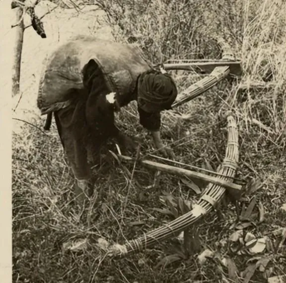 这张巨大的竹弩分弓臂和扳机,弓臂用粗篾绑了三层,扳机木头发黑,一看就是常年在手里捏,猎人弯腰理绳,草棵子把裤脚划出一道道白痕。
