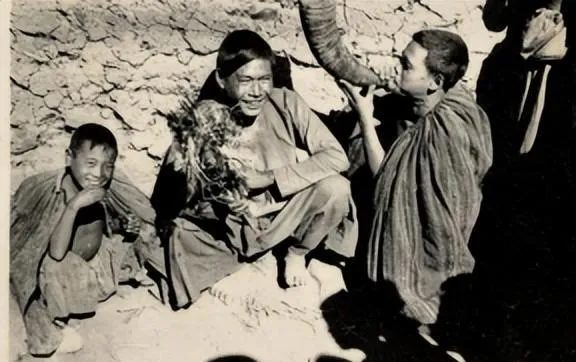 这只大角叫牛角号,嘴一贴就能吹出粗哑的音,旁边少年笑眯眯的,手里攥着花草,传说里角声一响,邪祟就认路走了。