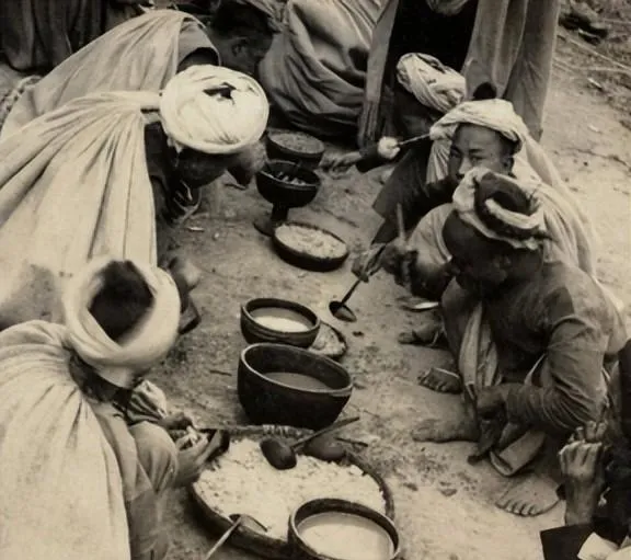 地上几只黑陶碗,米饭白亮,旁边一碗米汤,舀子敲在碗沿上叮一声,大家弯着腰吃,风把披风吹得一鼓一鼓,简单却不敷衍。