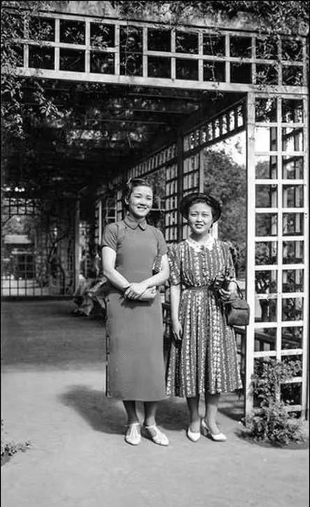 图中左边贴身旗袍的叫花楼女子,右边这位穿洋裙配小礼帽的,是那时城里最时兴的打扮,细看旗袍的小立领与斜襟滚边,布面细密泛光,腰线收得紧,脚下绣花鞋尖儿翘翘的,笑起来含着劲儿,既拘谨又体面,奶奶看了会念叨一句,以前姑娘出门讲究三分端正两分规矩,现在拍照倒自在多了。