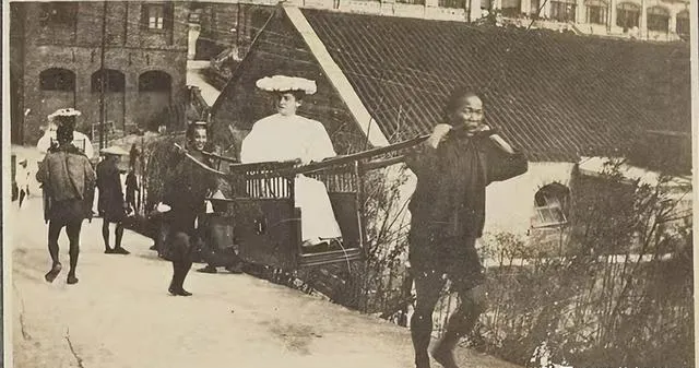 这张是小舆轿,细竹做杠,前后各两名轿夫,洋裙女人坐在轿内,宽檐遮阳帽很显眼,坡路窄而陡,轿杠被扛得微微下沉,后面的跟轿仔抄小步跟着,师傅们嘴里不吭声,肩头却咯咯作响,力气都在那一下下的起伏里。