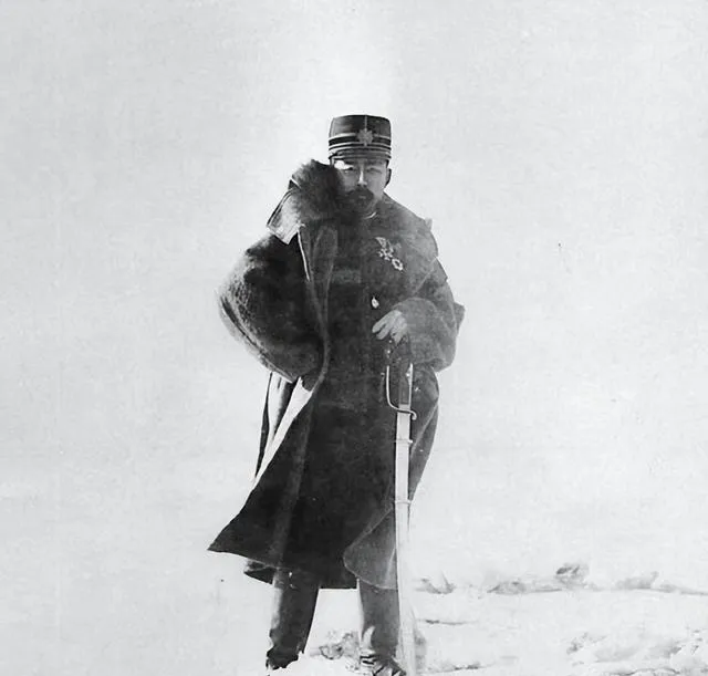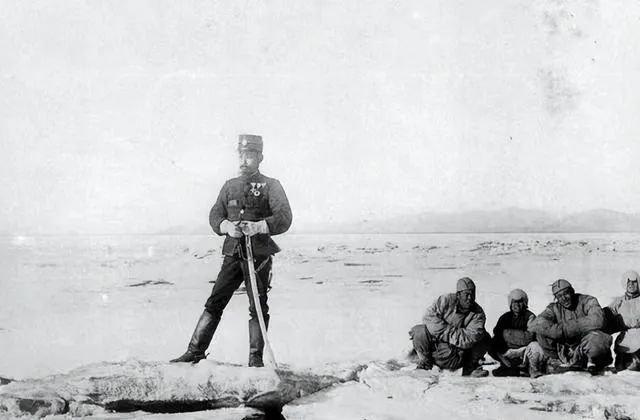 这两张都是冰面上拍的,日本军官披着厚呢大衣,胸前挂章,手里攥着长刀,个头不高,气却挺足,身后蹲着被俘者,抱臂低头不语,风刮得脸生疼,黑白照片里能感觉出来。