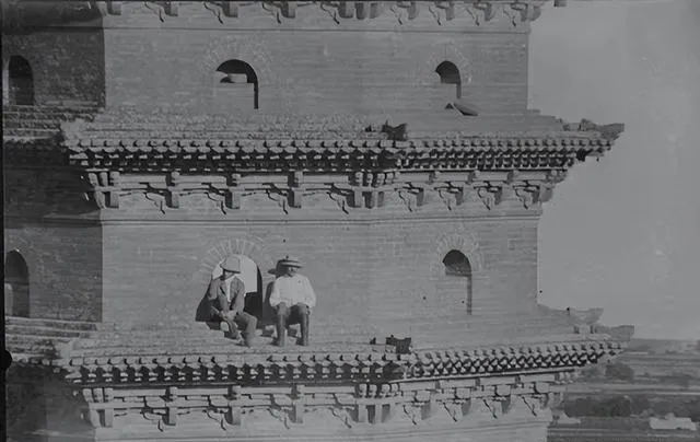 这个位置在塔檐兽头旁,砖缝里的小孔本是泄水用的,人却坐在那儿晒太阳,帽檐压得低低的,脚尖探在空中,旁边的滴水牙子一圈一圈,很细致,小时候我爹看这张就嘀咕,不懂规矩的人坐哪儿都当凳子。