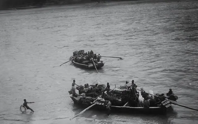 图中大船是羊皮筏子改的摆渡,前后各一梢公,桨叶宽而笨,船舷绑柴草挡浪,靠近处还有个男人抱着圆圈在水里趟,像是拖带或探深,河水混黄,一眼知是大河。