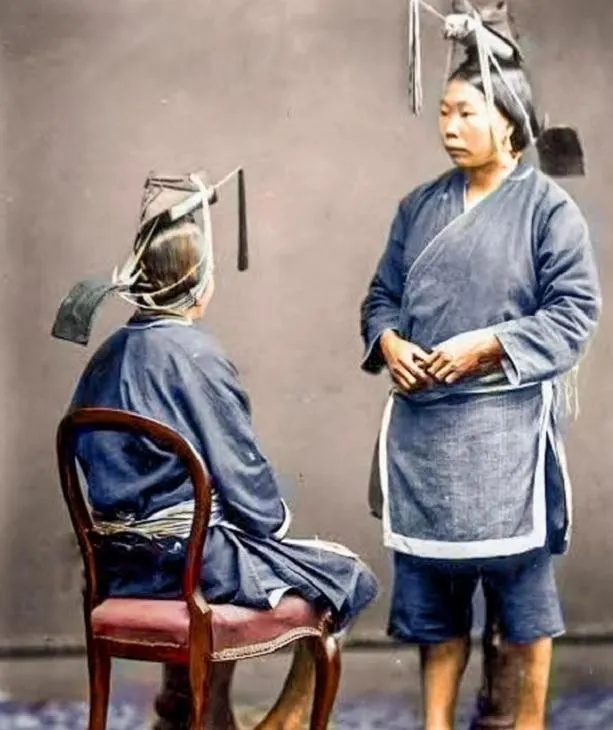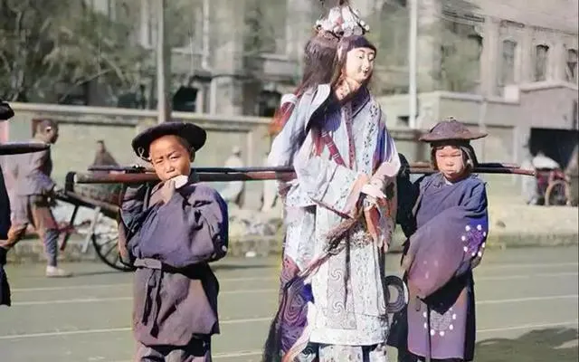 这个发具叫角式头冠,竹篾做骨,黑绒包面,前后垂饰随走随晃,衣料是靛蓝粗布,边上缀了白边,站着的那位腰里勒得紧,神情挺定,像是等人喊她进堂子。