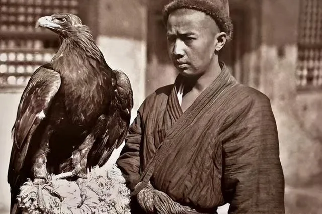 这个少年袖口宽,束发戴小帽,神情冷硬,臂上厚布裹得紧,金雕站在拳上,爪钩扎得稳,眼神比人还锐,俩活物就这么对着,像比谁先眨眼。