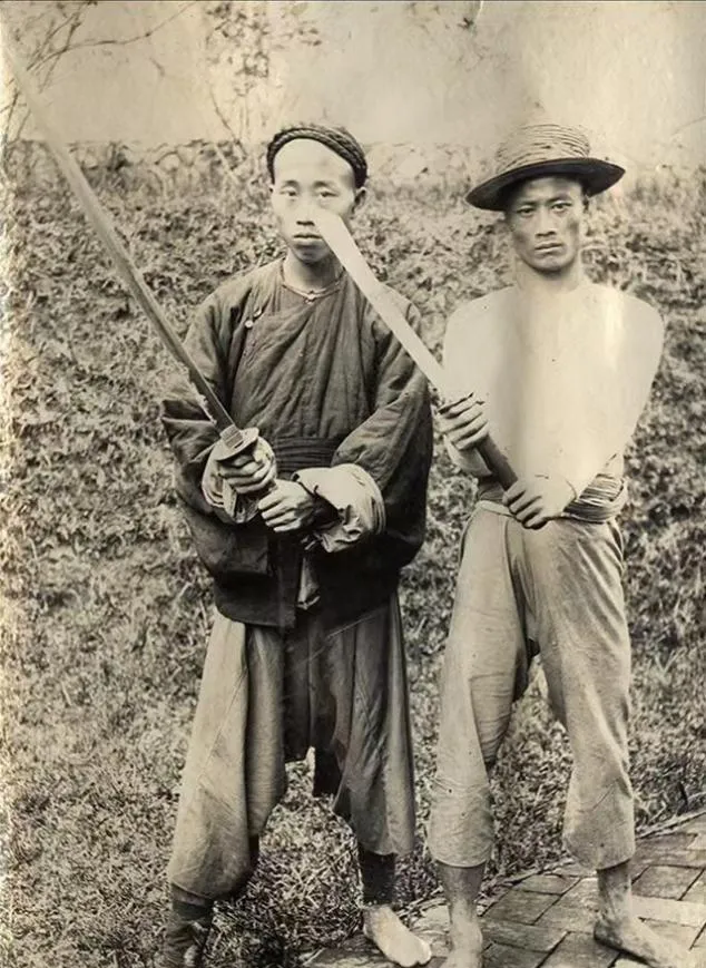 这对手里的大刀厚背宽刃,柄端包了布,脚下一软底鞋,站桩站得稳,照片没写身份,可看眼神就知道不是闹着玩的,刀在手心里有分量,沉得很。