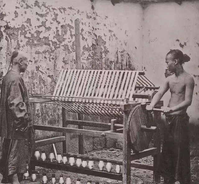 这台木制纺丝机,斜列的纺轴一排排,手摇把子一转就全带起来,地上是白瓷纱锭,站在旁边的小辫子手背在后,像个管事的,眼神老在查对面有没有偷懒。
