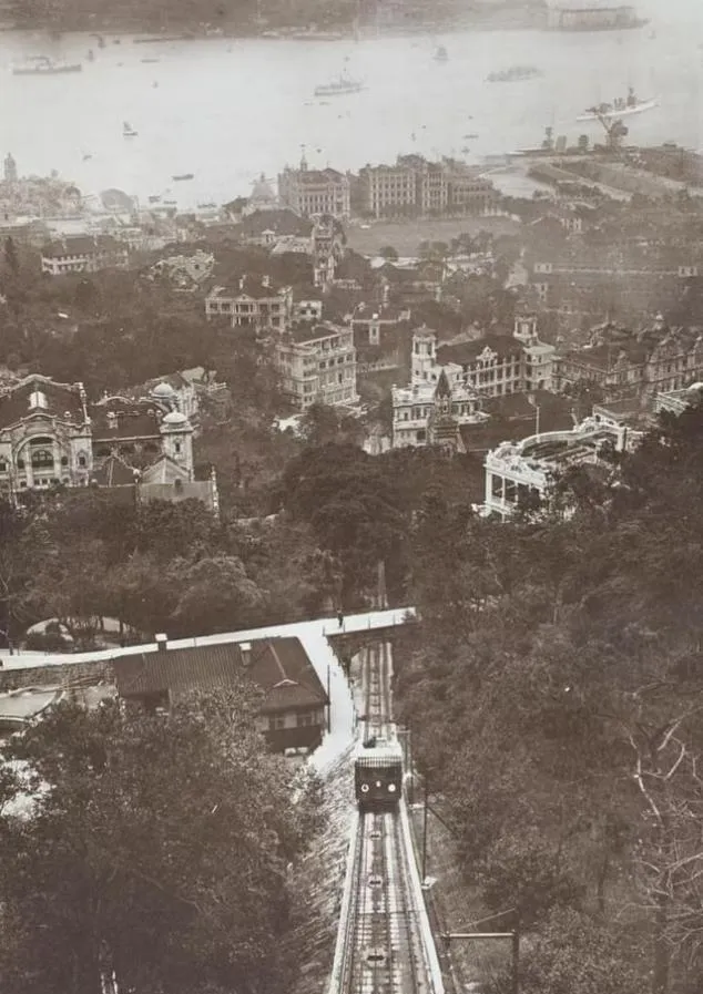 第一张街两侧中英招牌混站,旗子从楼檐挑出去,伞与轿子在人堆里挤,第二张是山顶缆车缓缓往上爬,铁轨在林子里像一道闪光,第三张皇后大街更热闹,商贩吆喝,帽沿此起彼伏,像潮水。