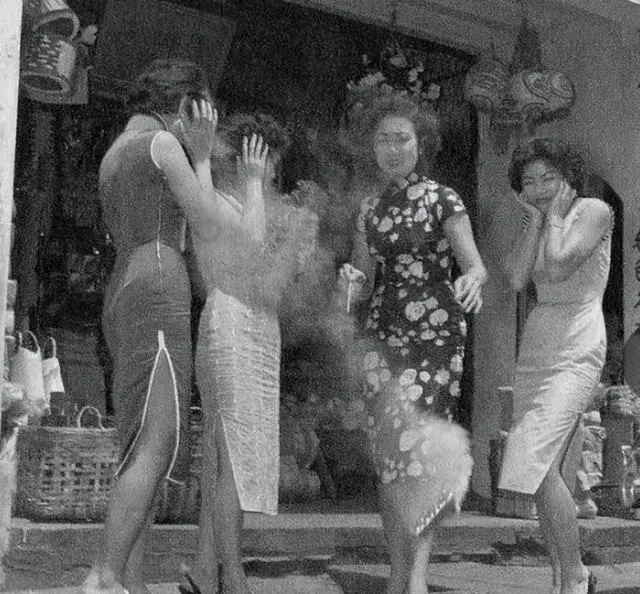四个旗袍女郎在店门口点炮仗,火星劈里啪啦,灰一股脑扬起来,她们下意识捂耳朵,裙摆被烟影糊了一下,笑得直躲,现在放烟花讲安全距离,那时候图个痛快。
