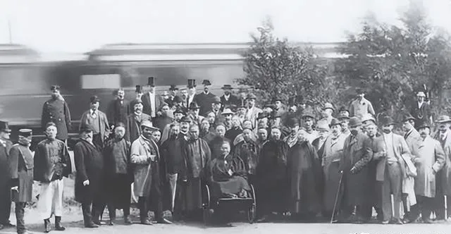 这张是出行前合影,正中那位坐着轮椅,身边是西装礼帽与长袍马褂的混搭,人多不乱,背后火车轰地掠过,像把旧与新的分了个界,一条线而已,世道就拐了个弯。