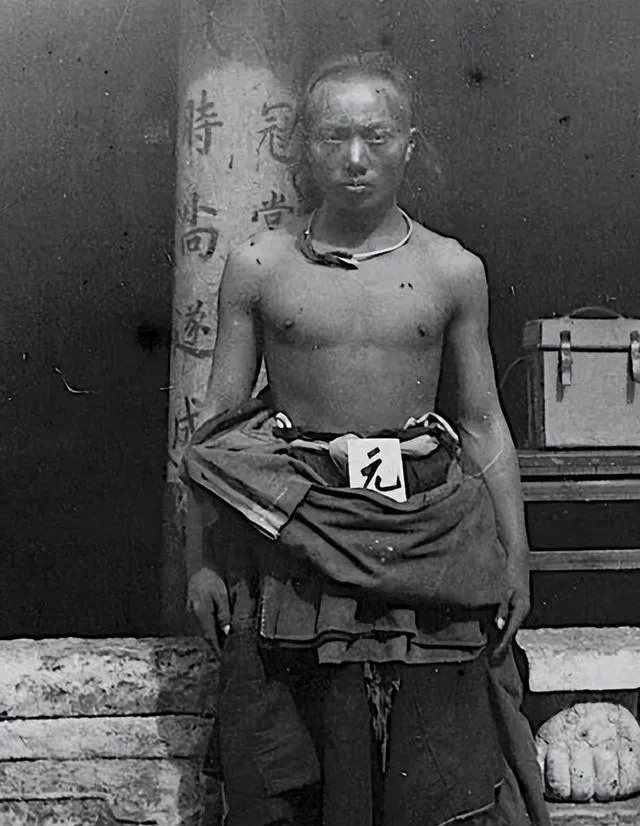 这个小伙腰间别着写“元”的纸签,赤膊站在门柱旁,可能是号簿顺序或班头的记号,脸上汗泥一道一道,眼神硬,站姿像钉子。