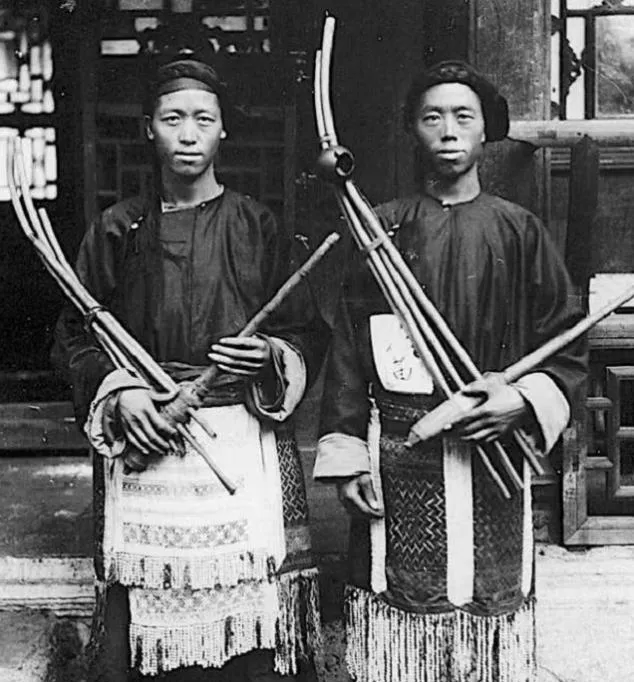 第一张是台地草屋前的生活场景,男人叼着短烟,娃娃赤脚踩泥,树影稀疏,第二张两位手里拿的是芦笙,管子弯弯,箍口泛亮,合起来吹,声音厚,像风从山谷滚出来。