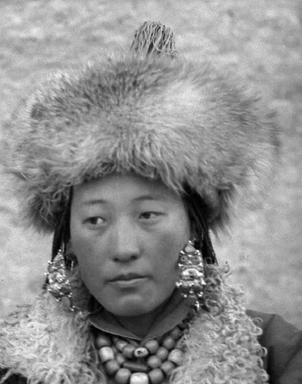 这位帽子是狐狸毛领,耳边坠金银串饰,胸前码着珊瑚与天珠,皮袍外翻毛边,风一刮整个人像长在雪里,单眼皮,高颧骨,神色坚韧,走路不慌不忙。