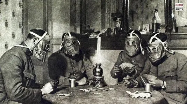 这几张脸全被面具罩住,灯芯油气味冲鼻,他们一边打牌一边等命令,窗台上瓶瓶罐罐晃着影子,笑声在橡皮里变形,那是毒气部队留下的日常,也是别人家一辈子的噩梦。