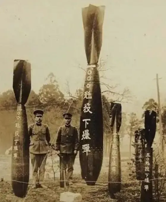 这几根立着的家伙是航空炸弹,黑油油的躯体上刷着白字,像故意让人看清楚,地面拉了绳子围着,两个军人摆着姿势拍照,笑得轻松,谁都懂,一旦起飞,下面就是一片火海。