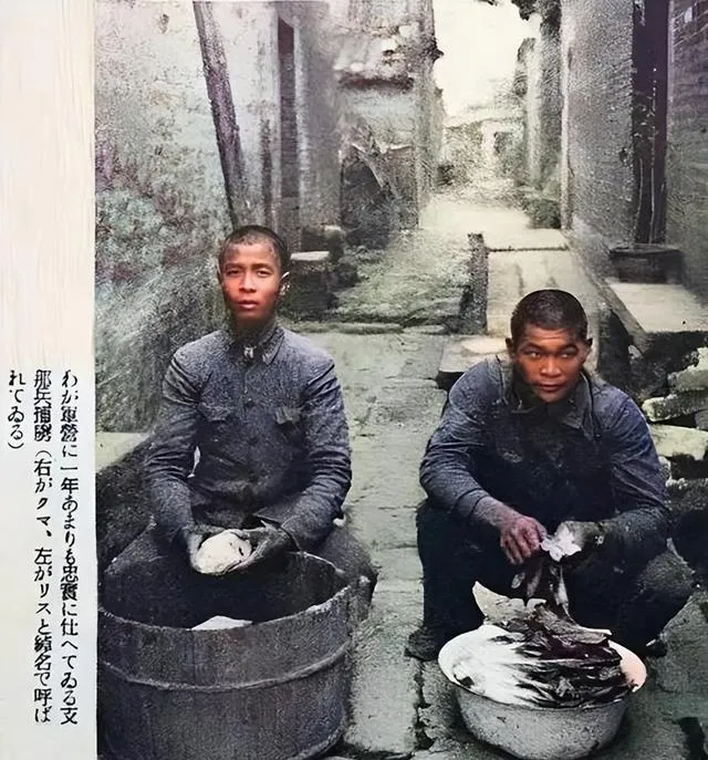 这两位被抓去当伙夫,右边叫锅巴,左边叫米斯,是日本在说明里给他们起的代号,脚边破盆里泡着菜叶和骨头,水面浮着一层油泥,巷子尽头灰白一片,冷得不见阳光。
