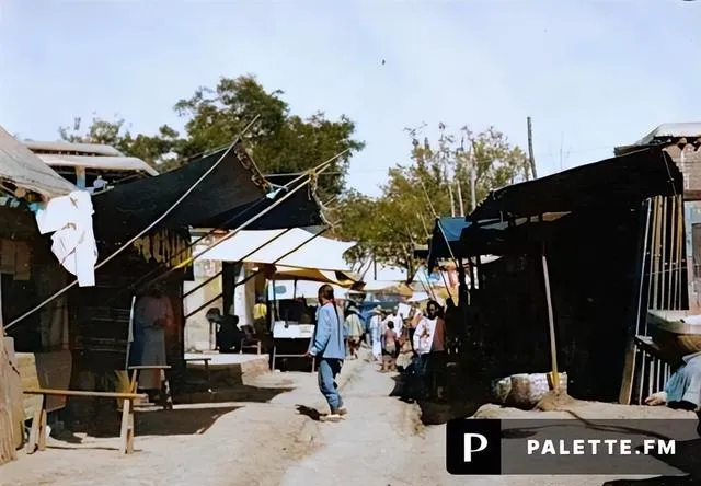 这个临时搭的叫遮阳布棚,几根木杆子支着,黑布白布混在一处,边上用绳子拴在墙角或木桩上,下面摊位一字排开,卖酱菜的木桶冒着咸香,拍鞋底的师傅把锤子噼里啪啦落在楦头上,风一过,布棚哗啦作响,跟现在的商场比不得体面,可也热闹得很,伸手就能摸到烟火气。