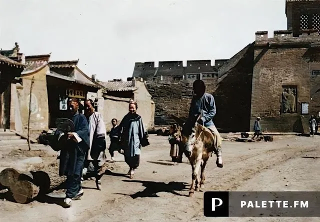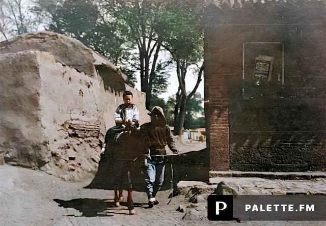这小家伙坐的还是驴鞍配马鞭,鞍前拱起一小节,方便抓握不打滑,旁边的大人牵着缰,地上是青砖胡同,拐角处贴着告示,风吹得边角翘起,我见过类似的老鞭子,细竹裹皮,甩出去一声“啪”,并不真抽,更多是招呼声,昔年巷子深,驴铃一响,左邻右舍就知道谁回来了。