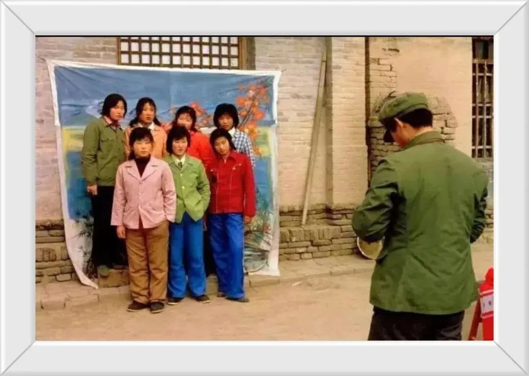 4. 1981年春节,河北霸县的农村,几位女同志聚在一起合影留念,身后只是一块简单的布景画布。在那个年代,想拍出好看的背景,只要换一块画布,就能拥有想要的风景。翻翻你家的相册,看看有没有这样的照片?