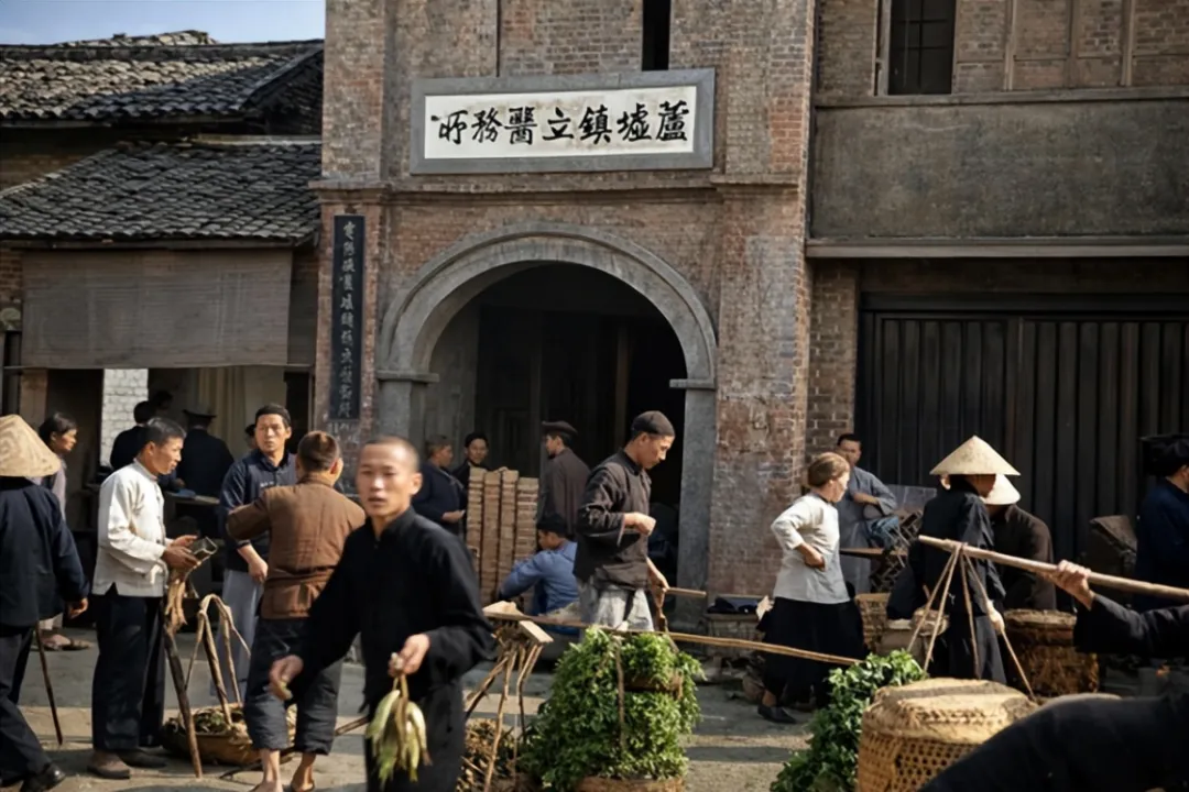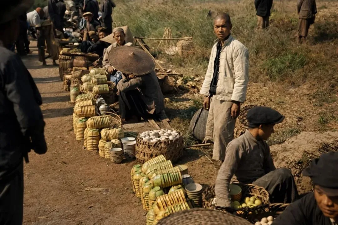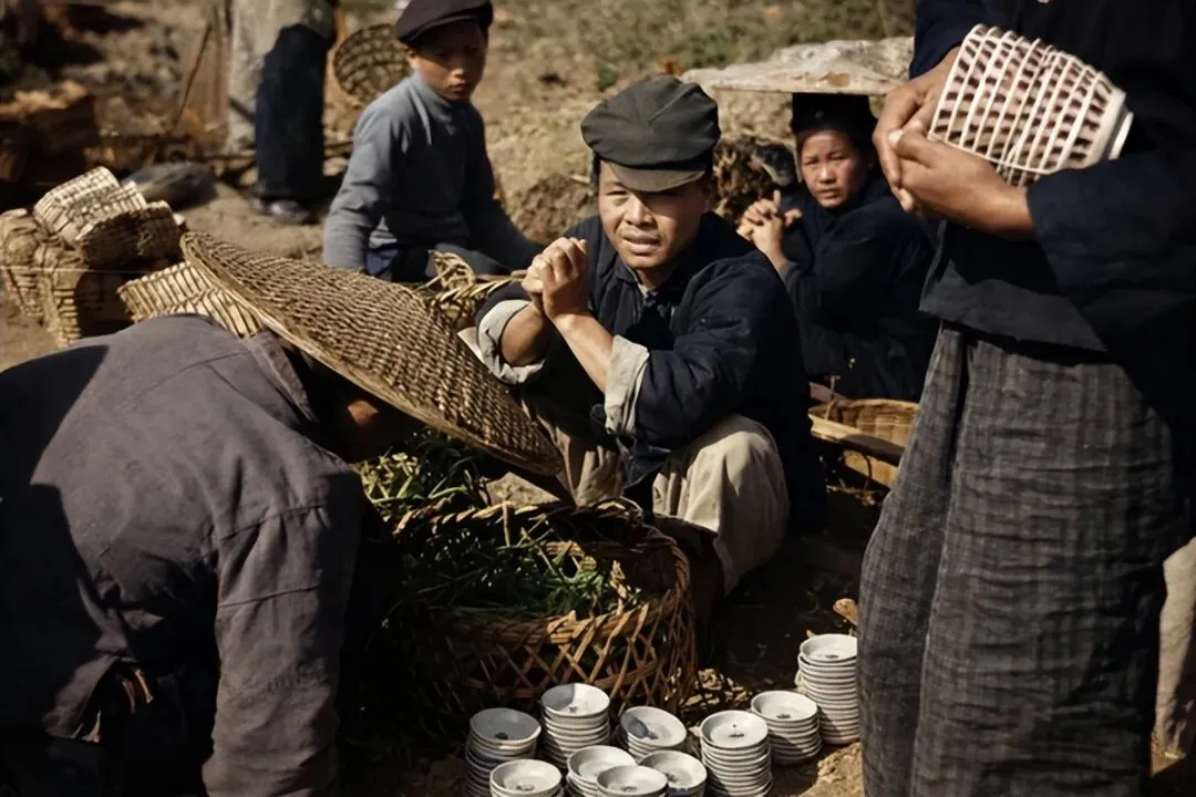 这组照片是上世纪四十年代宾阳芦墟赶墟的场面,我们对它进行了高清修复和上色,老日子一下子扑到眼前来了。墟场上人挨着人,扁担挨着箩筐,地上摆开一片片瓷碗瓷盘,白的、青的,在日光下泛着哑光。卖瓷器的贩子蹲在摊后,眼神里有一种老生意人特有的、不慌不忙的期盼。这不是什么名窑珍品,就是寻常人家灶台上、饭桌上的家什,可看着这些碗碟,我总觉得能听见当年墟场上的嘈杂,闻到泥土和稻草混着的烟火气。