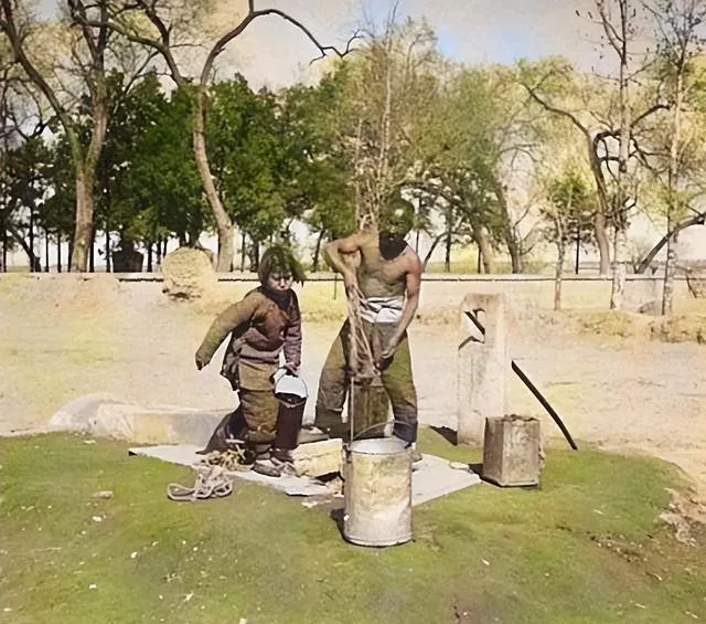 这一对父女在打水,长杆搅着桶里咕嘟咕嘟,女孩提着小铜壶,脚边草鞋丢在一边,太阳一晒,铁桶烫手,爸说以前挑一天水,手上能磨出两圈泡。