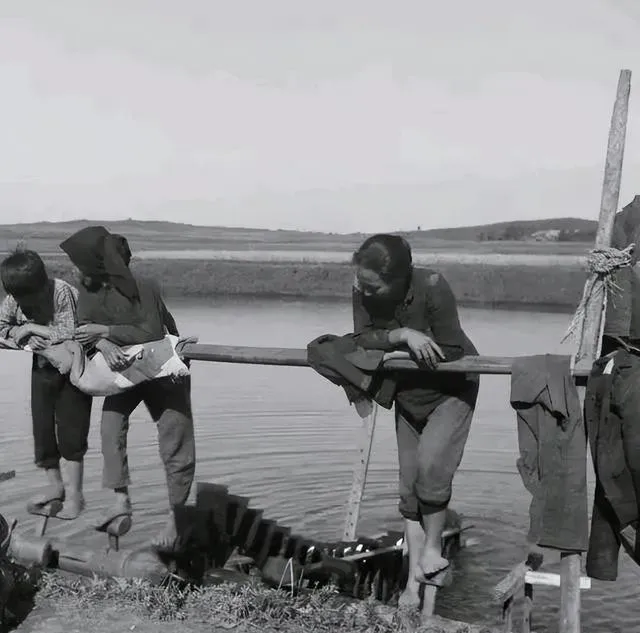 图里这玩意儿叫水车,脚踏板连着木齿轮,几个人一对儿踩得哗啦啦响,裤脚卷到膝盖,聊一嘴邻居家的鸡又不下蛋了,天黑才歇,回家还得做饭。