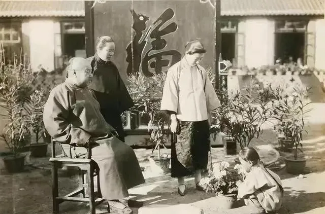 这叫摆年景,院里摆满花盆,红底黑字的福挂在屏风上,老爷子坐太师椅上晒太阳,太太和少奶奶站身旁,看着小孩儿刨土栽花,大家都笑得松快。
