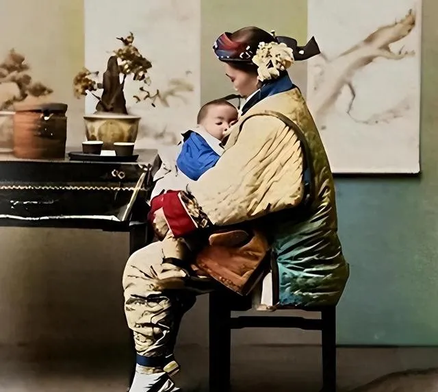 图中怀里抱着娃的就是奶娘,那会儿富贵人家都讲究用奶娘喂养,衣裳是厚实缎面棉袄,袖口嵌红边,肩上搭着布兜方便放小毛巾,坐姿端端正正,怀里小少爷裹着蓝肚兜眼神懵懂,家里人常说,贵人家的娘子要护身材,也怕母子情太黏,才有了这门差事,奶娘月钱不低,可规矩也多,吃什么都要清淡,夜里娃一哭就得起身,累是真累。