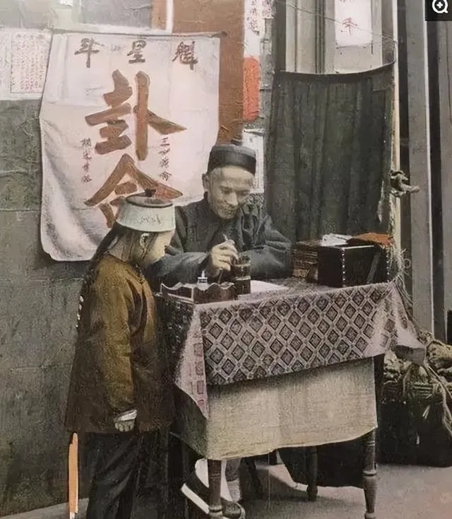 图里这桌上摆着铜钱、八卦盘、毛笔,叫江湖卦摊,一块绣着大字的布当招牌,小孩踮着脚伸头看,先生眯着眼掐指算,妈妈笑我小时候也爱蹭热闹,先生敲着木盒说,明日有财,记得早起,这话放现在像段子,可那时人心里真就靠这点盼头续着。