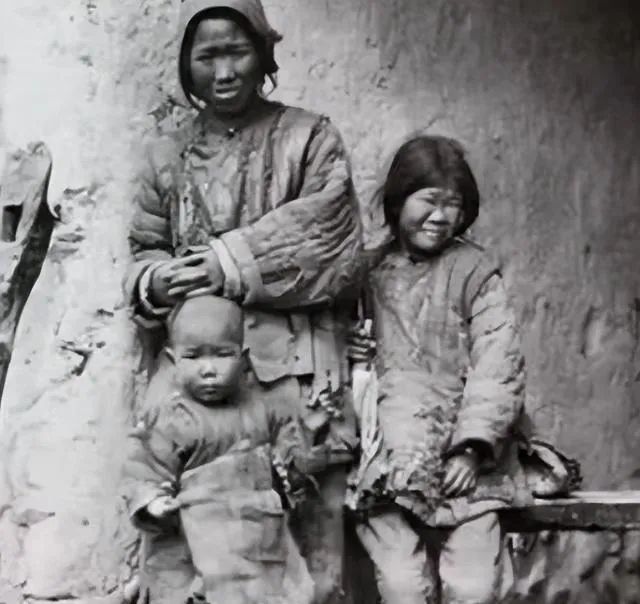 这张是要饭娘俩带着个小的,大布袄补了又补,袖口磨得起毛,女人眼神发空,小姑娘挤出个笑来,小的抱着破布条不撒手,以前的苦是看得见摸得着的,现在我们说穷,多半是心里的比较,不一样了。