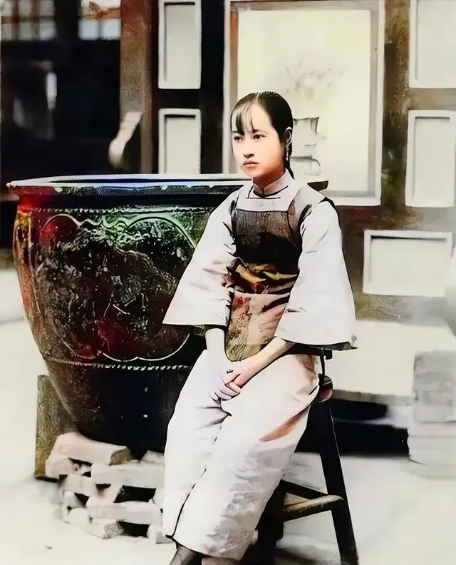这个穿素色长衫的女孩儿,发髻利落,眼神里有光,像新式学堂的学生,她身后的大缸釉色深,脚下垫着砖,姿态挺括,像在想题,又像在等人,时代就从她肩上轻轻拐了个弯。