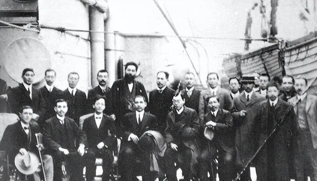 这群穿西装的先生并肩站着,帽子拿在手里,眉眼坚硬,是维新新派或商贾同人的合影,他们把胡子梳得利落,站在甲板上往前看,嘴里不说壮话,脚底却有劲儿,以前船慢,心急,现在网快,心反倒乱。