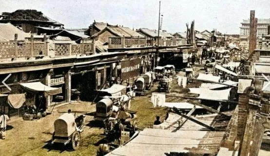 图中这条长街叫牌楼口旧市,青砖女墙上刻着纹样,檐下挂满布幌子,木架子挑出一溜白布棚子,遮日又挡风,车辙把泥地压出两道亮沟,车夫跟在后面小跑,手里攥着缰绳,吆喝声和讨价声混在一处,奶奶说那时候买碗热茶两文钱,蹲在路牙子上吹吹气就能喝一个早晨。