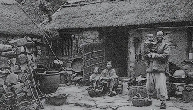 这张是穷苦人家的院子,石头垒的墙,门槛上摆着破竹篮,男人怀里抱着孩子,眼神直直的,地上锅底一圈白灰,妈妈低声说,以前柴米油盐不是词,是日子,能把米汤熬出一点黏就是好年景。