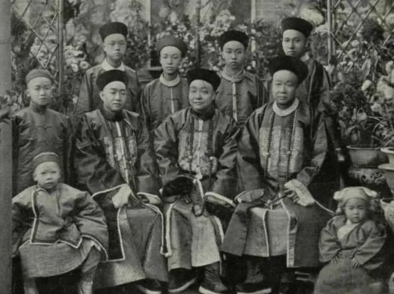 这张是显贵人家的团坐照,缨帽一排排,孩子被架在矮凳上直不起腰,旁边放着海棠花盆景,镜头一闪,几十年过去了,照片还在,院子早就没了影儿。