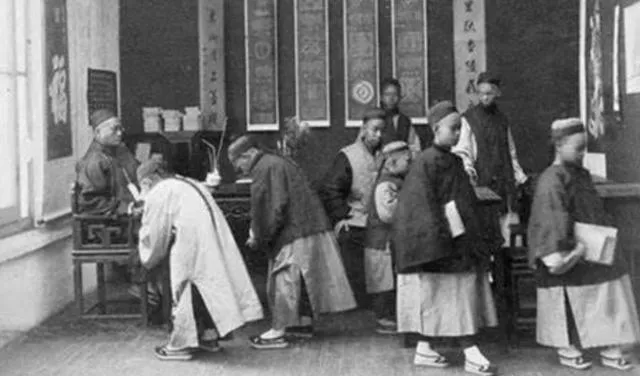 这个弯腰的是学生,手里捧着册子,先生背后悬着四书五经的条幅,墨香味混着脚步声,谁背不下来就罚站墙角,后来学堂换成新课本,黑板上写起英文字母,老先生把胡子一捋也不说话。