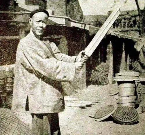 这把大刀背厚锋窄,握把裹着布条,汉子笑着比划两下,说是护院用的,旁边一摞圆铁盖,像是炉盖,风把尘土吹得满天跑,他抬手遮一下眼睛还是继续练。