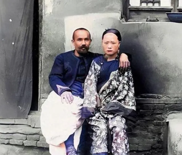 新郎的毡帽压到眉梢,新娘衣襟上堆绣繁密,手指绞着帕子不敢看镜头,背后是缠枝花的屏风,婚姻那会儿是两家人的事,不是两个人的事,欢喜也得按着规矩笑。