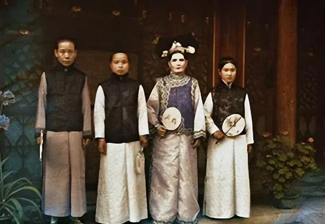 中间的主儿脸上扑着白粉,扇面挡在胸前,两侧的学员还没卸妆,眼尾的墨线拖得长,练功房里冬天结霜,木地板踩上去咯吱响,师父一棍敲下来说,再来一遍。