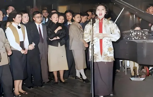 图中这位站在话筒前的人一张口,钢琴盖板都在震,丝绸立领外套配深色长裙,袖口和下摆的纹样在灯下有点发亮,台下挤着人,男士西装窄领,女士披着披肩,眼睛全追着台上那一抹光,小时候我家里那台老收音机偶尔也能收到沪上的演出转播,奶奶总说,听,嗓子里的金边儿来了,别说啊,真就有那股亮劲儿。