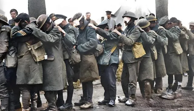 这串人肩搭着肩,眼睛被绷带遮住,长外套泥点子糊了一层,腰间的水壶和弹袋互相磕碰,叮当一片,地上积水映着天空的白,救护站大概就在前面几步,照片上色了,污泥的冷味儿和皮革的潮味儿就一起上来了,走得慢,脚跟贴脚尖,谁也不敢丢了谁。