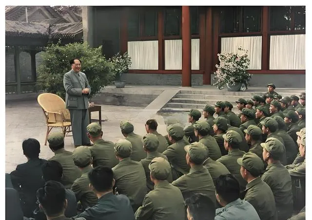 这张叫庭院讲话,前排坐满了军装小伙子,领口笔挺,帽檐排成一条弧,院里梧桐叶子正绿,讲的人站在藤椅旁边,手背贴着手心,像在谈一件要紧又要细的事,院门口摆着一把木椅,脚上那圈影子是午后的阳光切出来的,稳。