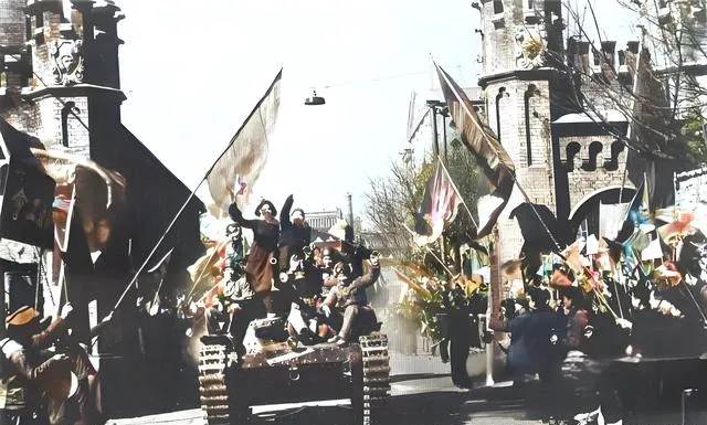 这辆小坦克开过拱门,旗帜挤满画面,彩带在空中打着滚儿,城楼的阴影像被拉长的琴弦,车上站着人,袖口挽到肘,喉结亮着,嘴里喊什么听不清,只看见牙齿一闪一闪,街边的人伸手去够那面旗的流苏,欢呼是热的,尘土也是热的。