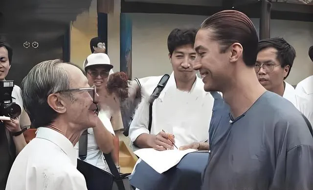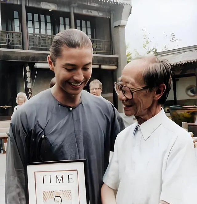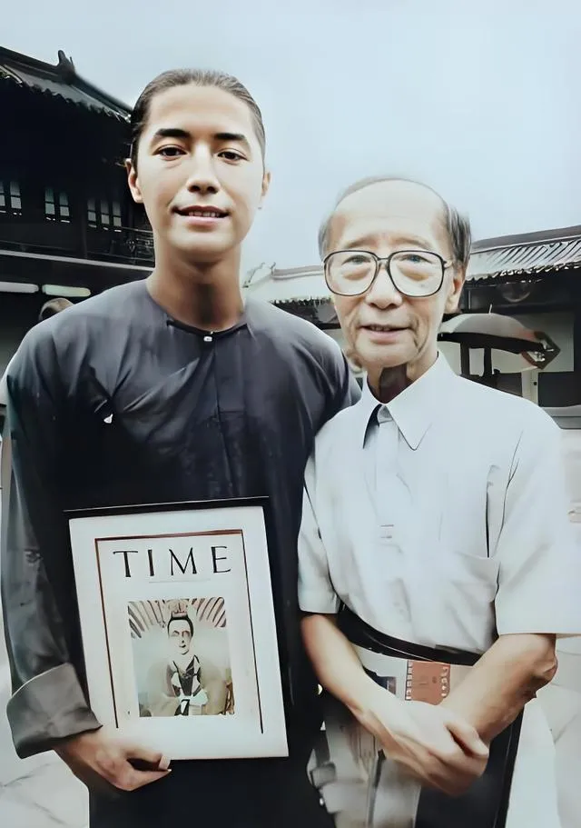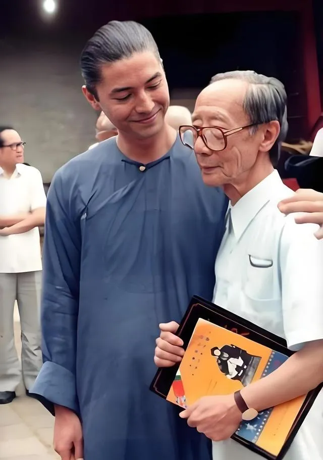 照片里的两个人,一个握着册页,一个把手搭在他肩上,蓝灰长衫垂到脚背,衣料发着柔光,老先生笑得瘦瘦的,眼镜腿贴着鬓角,旁边有人举着本子等签名,空气里有粉墨味和旧木门的漆味,像刚唱完一折还没散场。