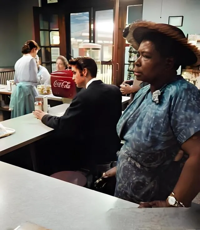 这张叫隔座的等待,吧台里头热闹,奶昔机冒着声,前排男人端着杯子落了座,身后这位女士却只能站着,帽檐宽宽地罩下阴影,手背青筋鼓起来,一冷一热就摆在同一条台边上,时代的味道一下就刺鼻了。