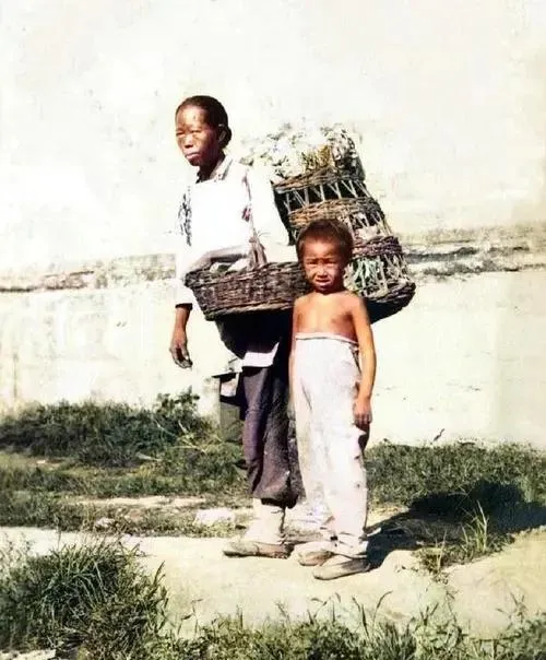 图中这对母子身上的竹编背篓叫箩筐,篾条细密,边沿包着粗竹皮,肩上再搭一根扁担,走一步篾丝就吱呀一声,我奶奶说挑过一整天山路,回来肩窝里都是血印子,那时候孩子没衣穿,裤腰一系就跟着走,天黑了也不敢停。